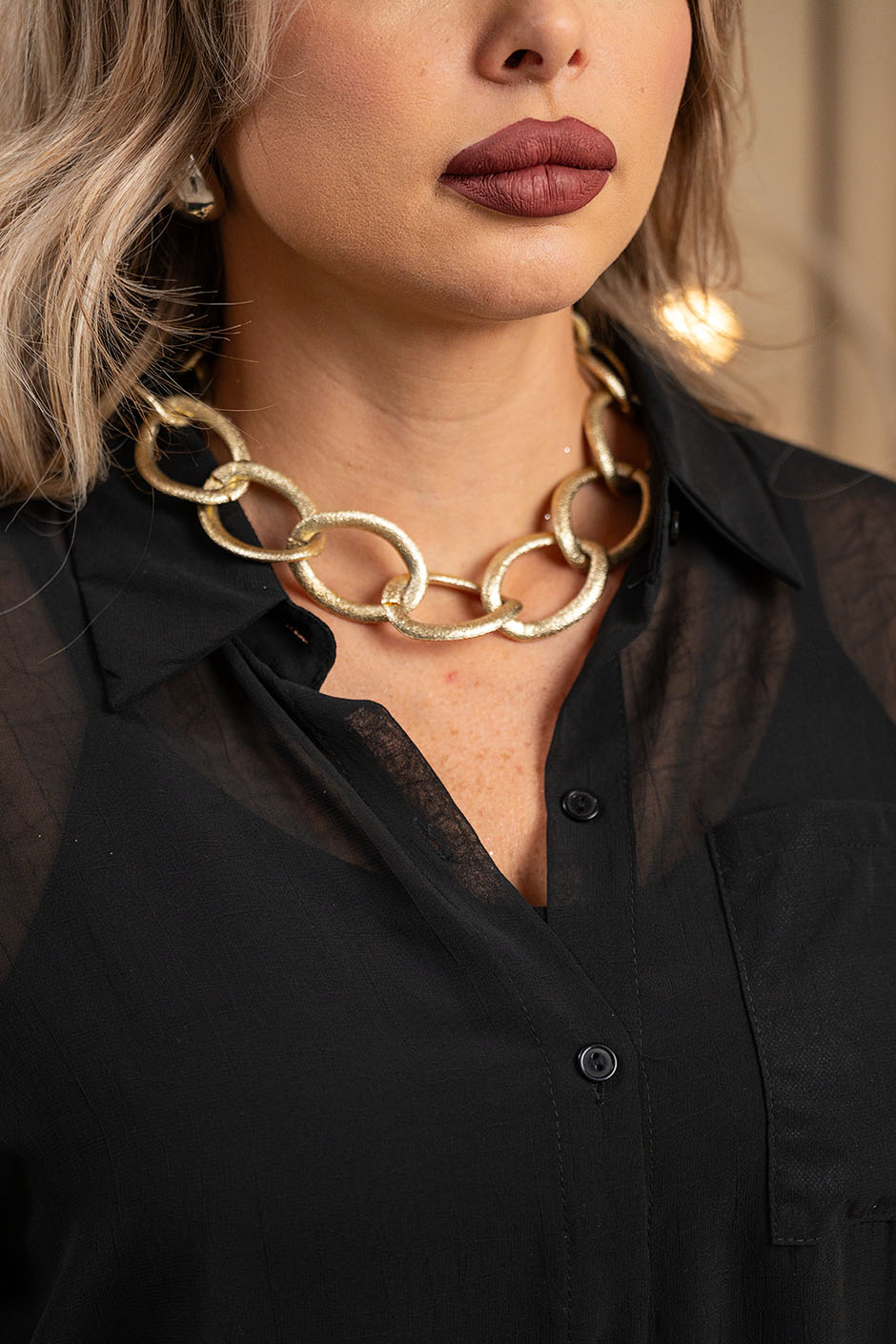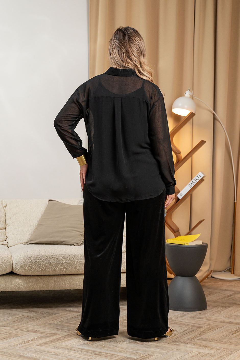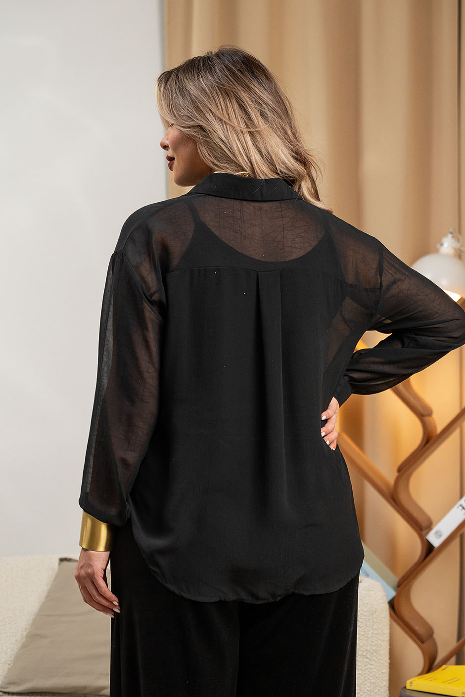 Ткань: шифон жатка. Рубашка свободного покроя, воротник на стойке,спереди застежка на пуговицы, на груди карман, спинка на кокетке, со складкой. Рукав длинный, на манжете. Длина ок. 67 см.