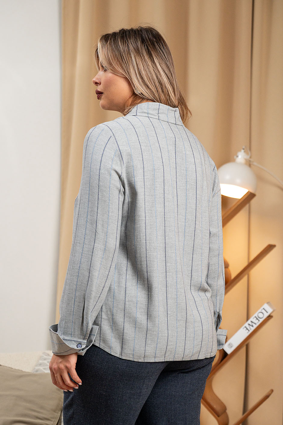 Ткань: вискоза. Рубашка прямого покроя, рукав втачной, воротник на стойке, спереди застежка. Рукав длинный с манжетом на одну пуговицу с декоративным отворотом. Длина изд. ок.65 см