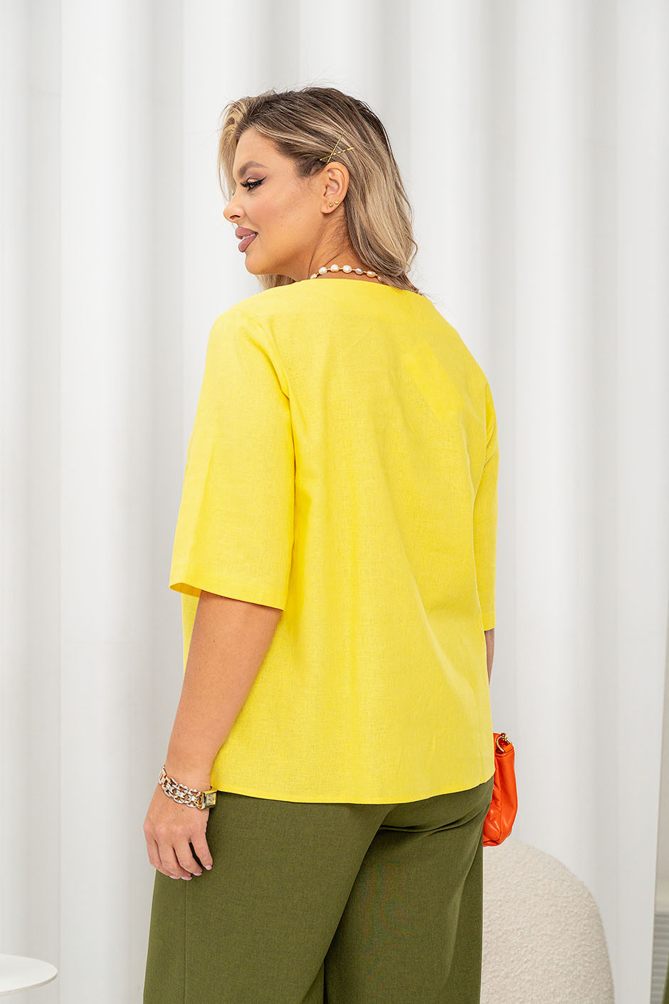 Ткань: лен. Блузка свободного покроя, спереди имитация асимметричной застежки. Рукав до локтя. Длина изд.по спинке ок.67см.