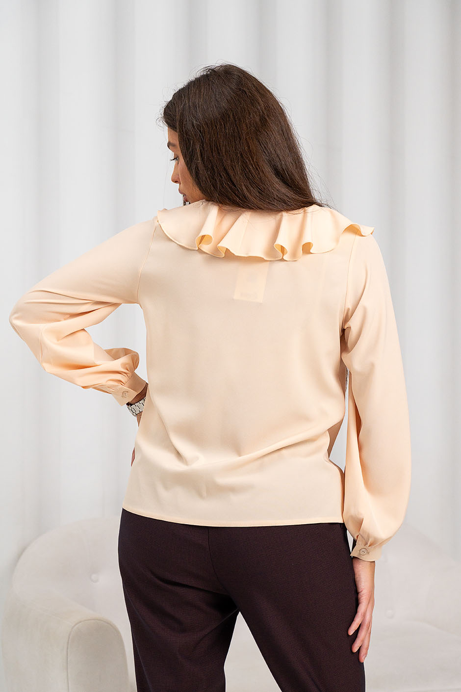 Ткань: искусственный шелк. Блузка простого покроя, с V-образным вырезом, по вырезу рюша, Рукав длинный на манжете. Длина изд. ок.65см.