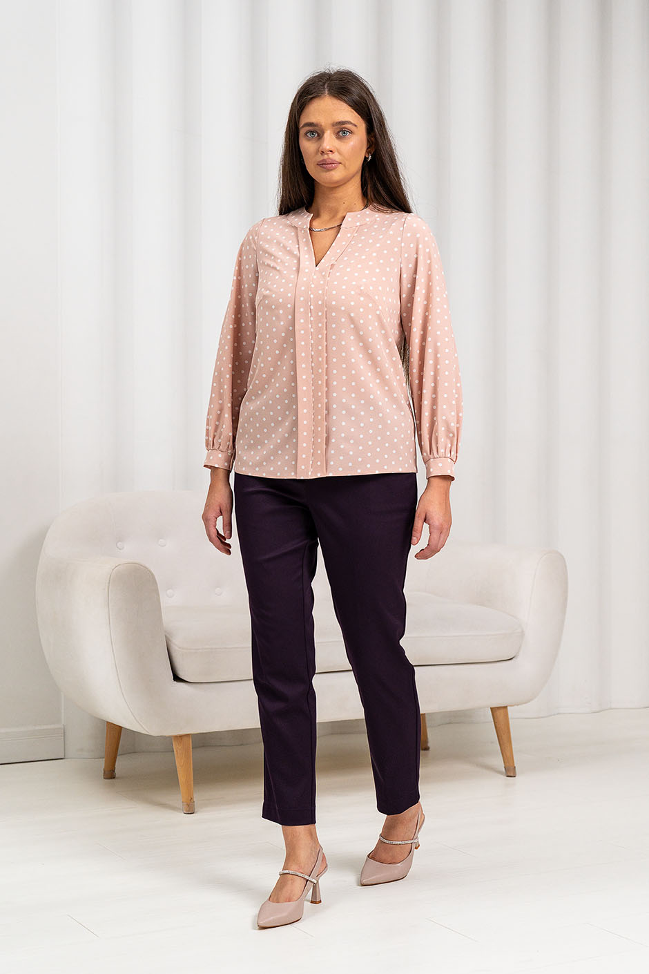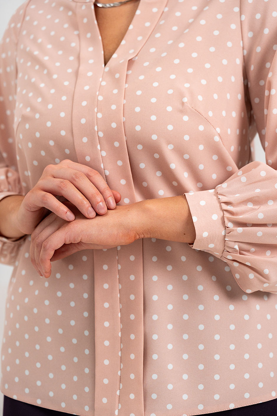 Ткань: искусственный шелк. Блузка прямого покроя, спереди бантовая складка, переходящая в лежачую стойку. Рукав втачной, длинный на манжете. Длина изд.ок.65см.