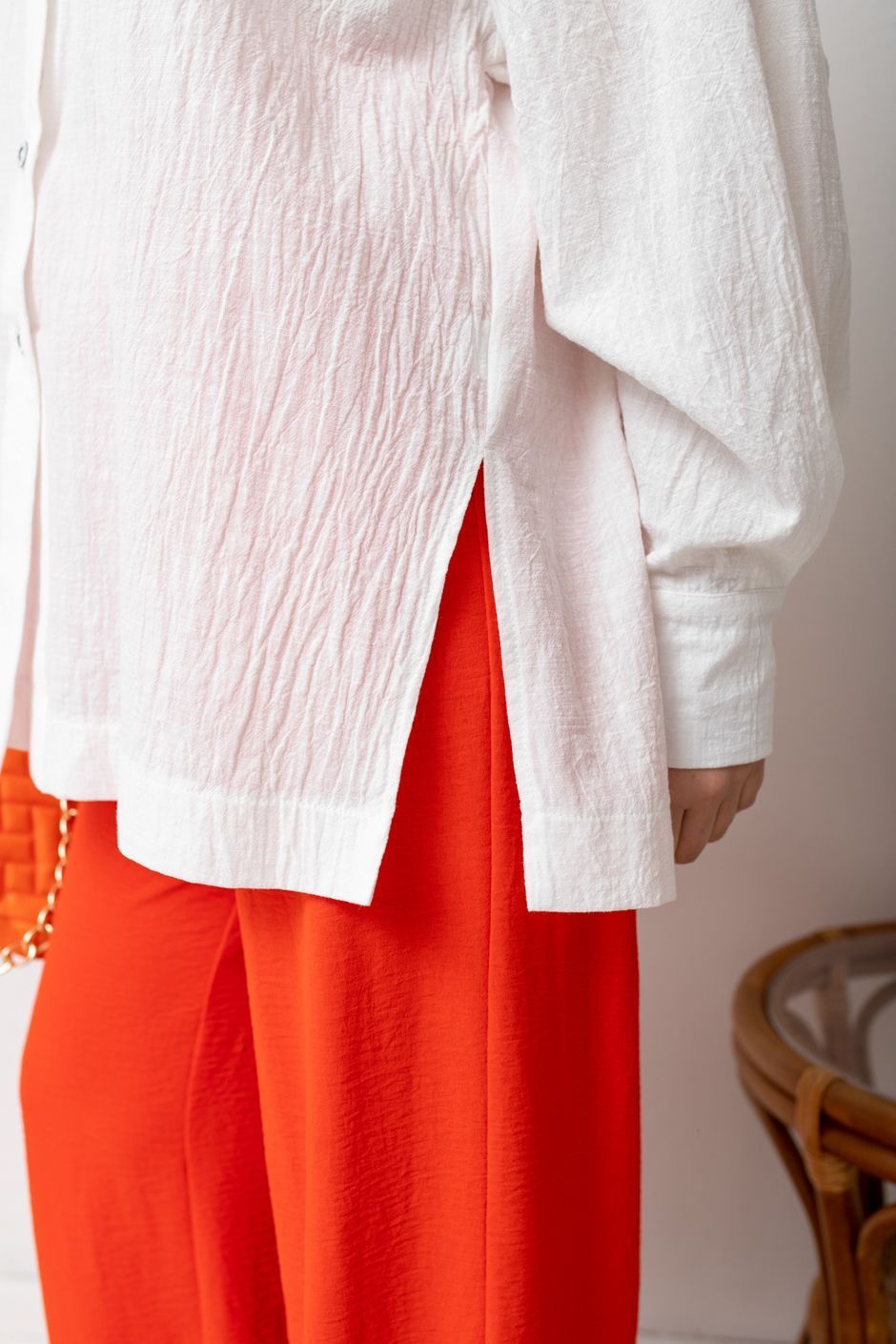 Ткань: хлопок однотонный с эффектом креш. Рубашка очень свободного покроя, линия плеча занижена, воротник на стойке, спереди застежка на пуговицы. Рукав длинный, на манжете.
