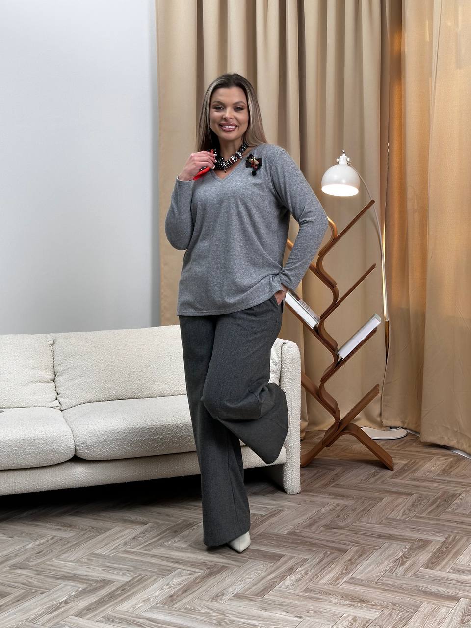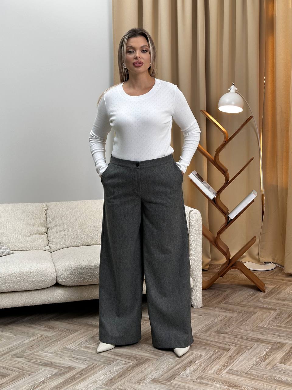 Ткань: трикотажное полотно. Брюки-паллацо,с широкими, сзади пояс на резине, в боковых швах косые карманы. Длина по внутреннему шву ок.81см.