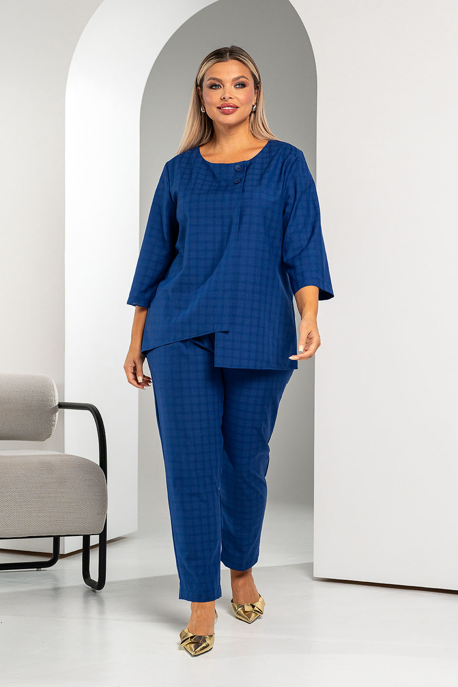Ткань: костюмная. Брюки свободного покроя, пояс сзади на резинке,спереди – пояс-кокетка, книзу зауженные, в боковых швах – косые карманы, посадка - высокая. Длина изд. 7/8,  по внутреннему шву ок. 72 см. Данная модель идет в комплект к блузке ТБ-127 клетка василек.