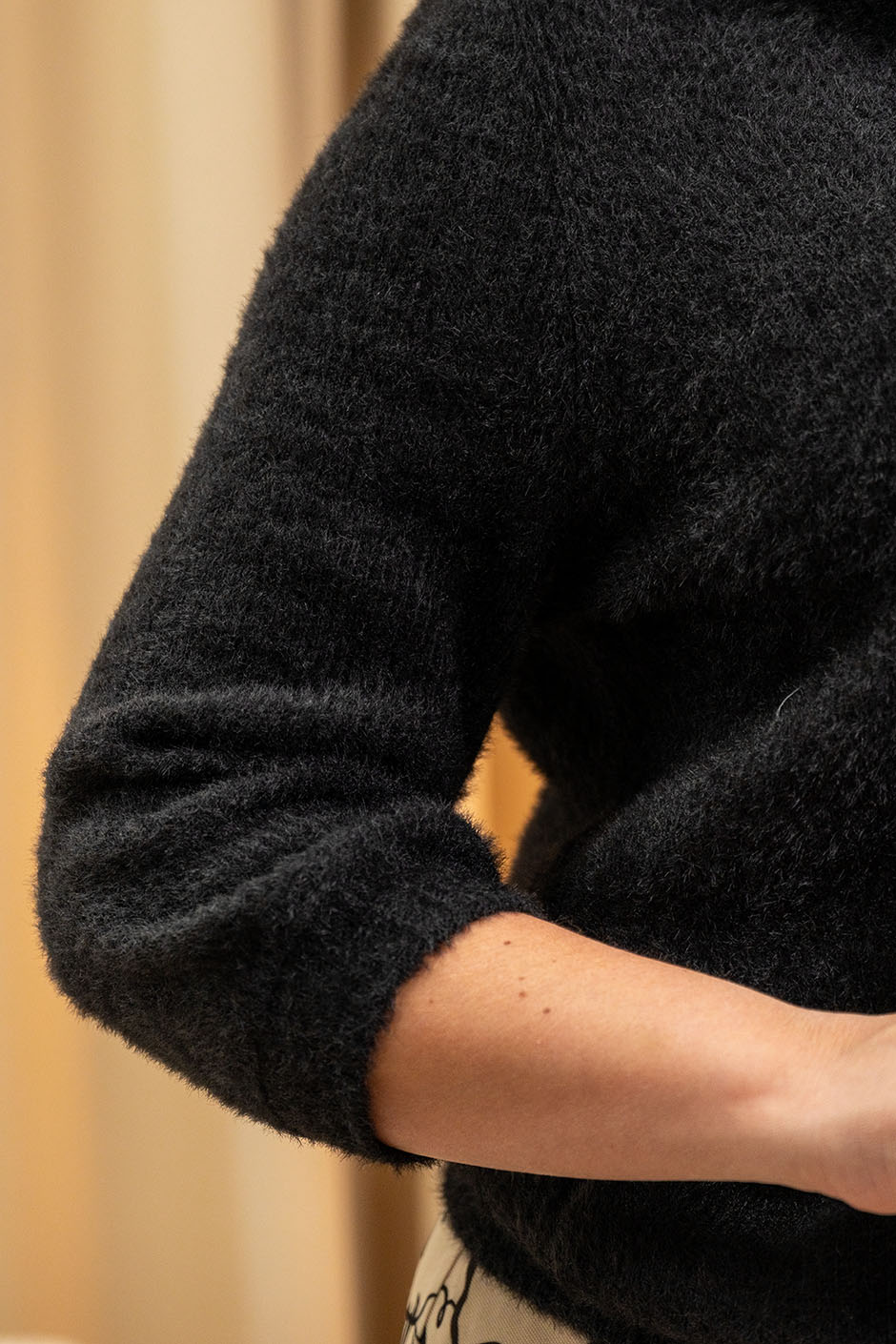 ткань: трикотажное полотно с ангорой.Джемпер с воротником апаш на ножке. Рукав 3/4 на манжете.